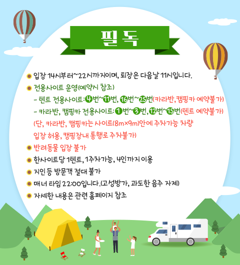- 전기 사용: 사이트당 콘센트 제공 (릴선 필수)
